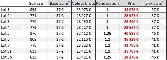 Le prix de chaque lot est calculé sur un prix de base de 37 € au m2 auquel est appliqué une pondération en fonction de la situation du lot. La somme des achats doit couvrir les frais d’aménagement engagés par la commune.
