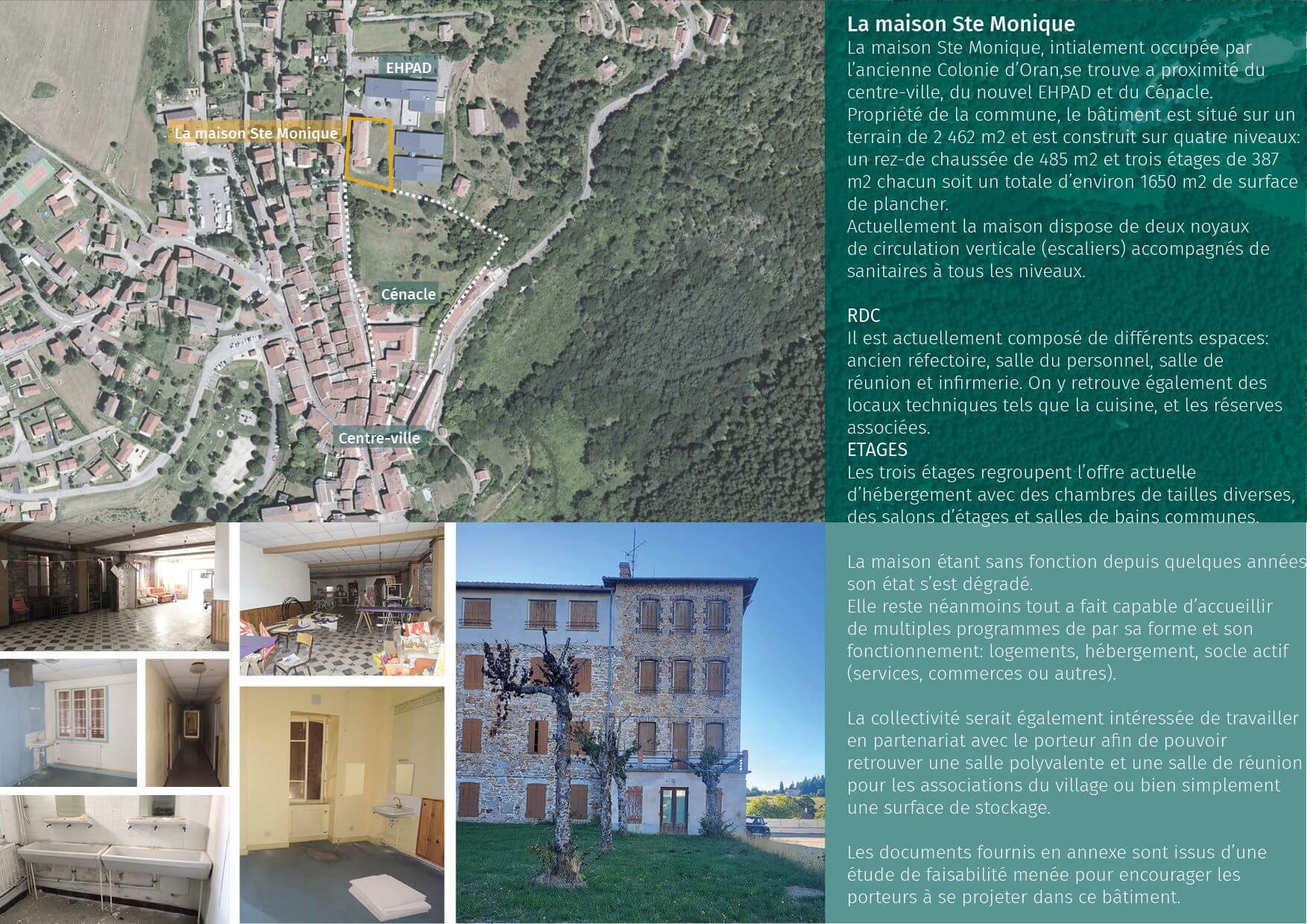 Parmi les bâtiments du patrimoine immobilier de la Commune, le bâtiment Sainte Monique tient une place particulière.Son histoire est étroitement liée à celle du village au cours de la première moitié du XXe siècle. Sa situation est exceptionnelle, dominant les Alpes. Le bâtiment, désaffecté depuis plusieurs années, sert aujourd’hui principalement d’entrepôt pour le matériel des associations du village. Sa structure (toit, murs, niveaux) est en bon état, mais les aménagements intérieurs sont à réviser complètement.