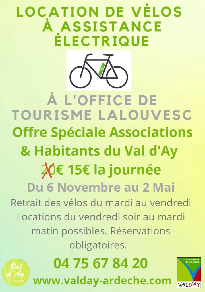 Une offre à tarifs préférentiel réservée aux habitants du Val d’Ay et membre d’associations du territoire est proposée pour une plus longue période : concernant la location de vélos à assistance électrique elle s’étend jusqu’au 2 mai 2022 et concernant la vente de tickets pour le Safari de Peaugres, elle est valable jusqu’en mars 2022.
