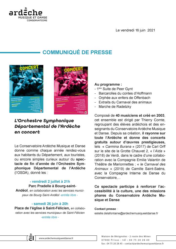L'orchestre philarmonique départemental de l'Ardèche en concert les 26 juin et 6 juillet
