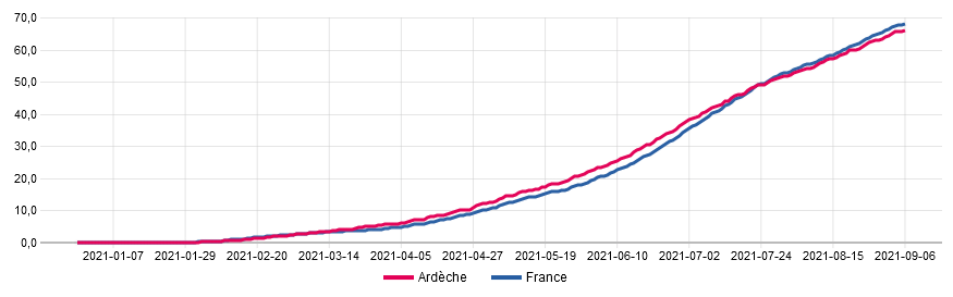 66% des personnes sont complètement vaccinées et 71,5% ont reçu au moins une dose en Ardèche au 8 sept, un peu moins bien que la France entière (68% et 73,1%).