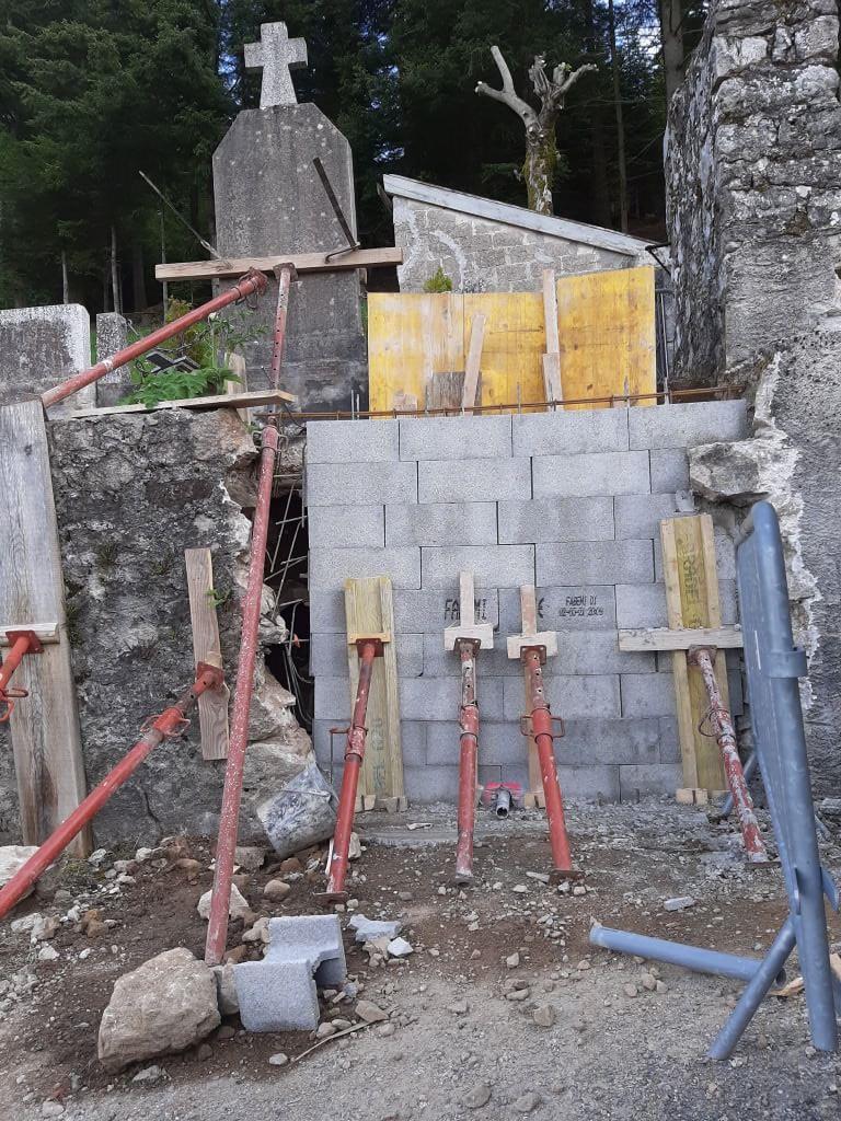 La première tranche de travaux sur le cimetière a démarré. Comme prévu, il fallait démonter le mur sur quelques mètres, l’étayer, ferrailler profond dans le sol pour éviter toute bascule future, prévoir le drainage avec galets et drains, reconstruire le mur en moellons en attendant l’habillage en pierre… puis laisser sécher avant le démarrage de la tranche suivante.