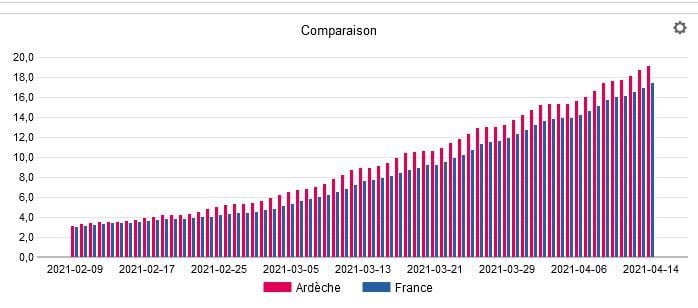Enfin, voici l’état de l’évolution de la vaccination en Ardèche. Le taux de ce jour en Ardèche est de 19,1% contre 17,4% sur toute la France (source Santé publique France).
