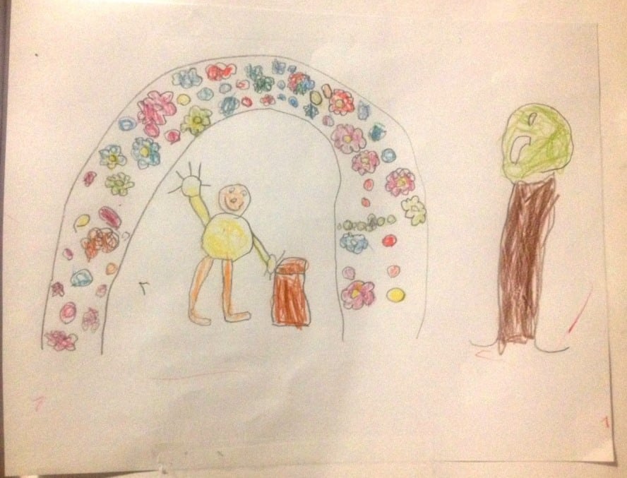 Joachim (4 ans et demi) devait raconter quelque chose de ses vacances dans son cahier de vie. Il a choisi de dessiner et de parler de l’arbre à souhaits de Lalouvesc.