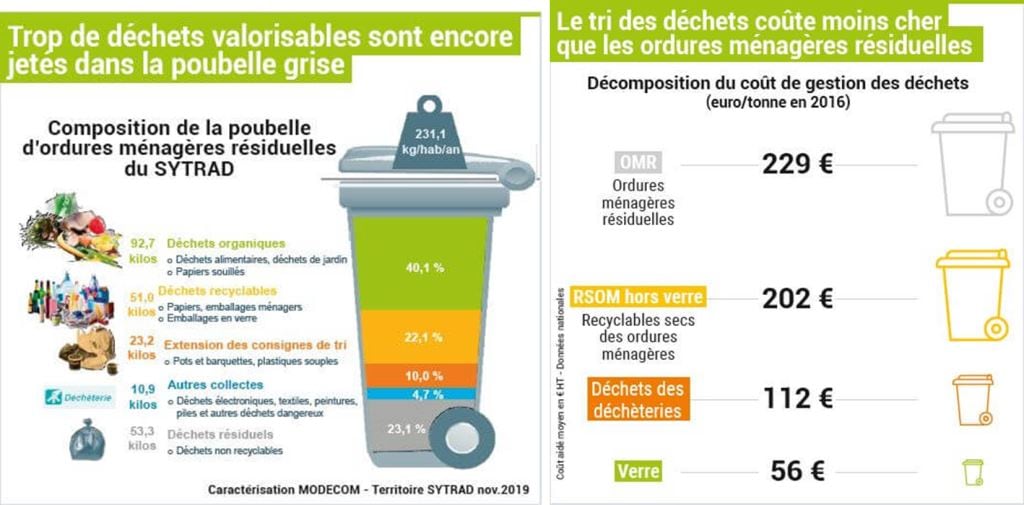 Les consignes de tri des ordures sont trop mal respectées dans le village. Pourtant, il n’est pas besoin d’un long discours pour comprendre leur importance. Sans même reprendre des arguments écologiques, il suffit d’observer les deux schémas présentés ci-dessus. Ils ont été réalisés par le Sytrad, l’organisme qui ramasse les poubelles de notre village. Le manque de discipline dans le tri, démontré par la composition d’une poubelle moyenne ramassée sur le réseau de récolte, conduit à de lourdes dépenses inutiles… payées par nos impôts, du fait de l’importante différence de coût de traitement des déchets.