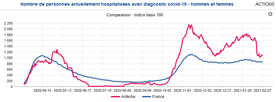 Même si la vaccination avance, la pandémie n’est pas terminée et il ne faut surtout pas relâcher notre vigilance et notre application des consignes sanitaires. On trouvera ci-dessous l’évolution du nombre d’hospitalisations dues à la Covid dans le département (les chiffres ne sont pas absolus, mais relatifs pour permettre une comparaison avec l’ensemble de la France). On observe clairement la deuxième vague, suivie d’un rebond, puis d’une chute brutale, sans doute due aux effets conjugués du couvre-feu et des premières vaccinations. Il ne tient qu’à nous que cette tendance se poursuive.