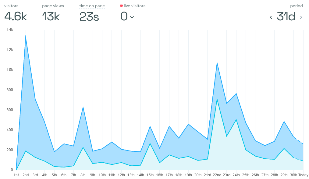 Le graphique ci-dessus retrace l’évolution quotidienne de la fréquentation du site lalouvesc.fr au cours de son premier mois. La courbe du bas en bleu ciel représente le nombre de visites (chaque fois que quelqu’un est arrivé sur le site), la courbes du haut représente le nombre de pages vues (un visiteur peut consulter plusieurs pages).