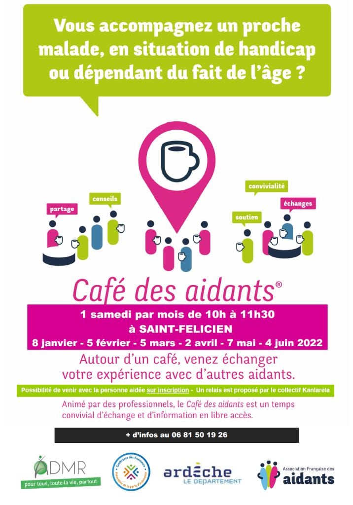 Le prochain café des aidants de St Félicien aura lieu samedi 5 février 2022 de 10h à 11h30 à l’Auberge de St Félicien sur le thème « Une histoire d’aide, une histoire de famille ».