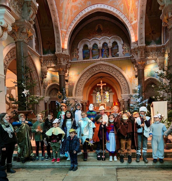 A 9 h, une joyeuse troupe, savamment costumée, a gravi les marches de notre Basilique et s’est installée dans le chœur. Il ne manquait personne. Les bergers facilement reconnaissables avec houppelande et grand bâton… les brebis représentées par les plus petits cachés derrière leurs masques, fabrication maison, et, bien sûr, les “Rois Mages” magnifiquement vêtus et, plus étincelante encore !, l’étoile qui les guidait. La maitresse lisait “le conte” (inspiré des évangiles) et les enfants mimaient et chantaient.