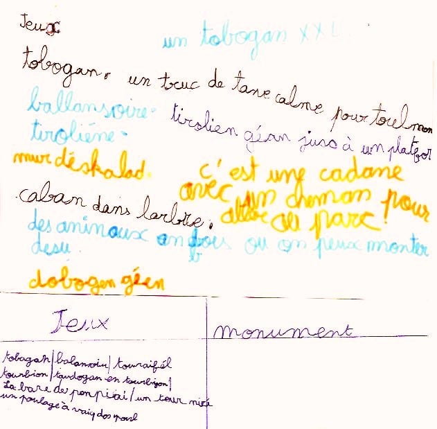 Les enfants de l’école Saint Joseph ont aussi travaillé sur le projet de jeu-monument. Extraits du compte-rendu des ateliers tenus à l’école par André Lamourère qui les a animés :