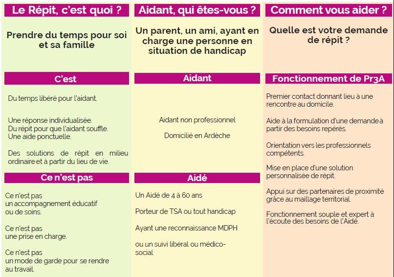 La plateforme de répit PR3A se charge d’organiser des temps de répit pour les aidants qui ont à leur domicile, un enfant, un adolescent ou un adulte en situation de handicap.