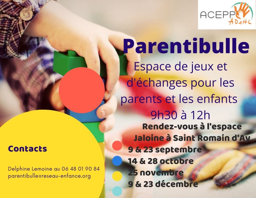Après un repos estival, le Parentibulle reprend ses accueils le vendredi 9 septembre à partir de 9h30 Espace Jaloine à St Romain d’Ay.