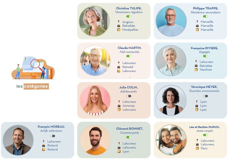 A partir d’entretiens individuels, une série de personnages-types représentatifs des usagers de l’information locale a été construite. Dans le jargon des designers, on les appelle des personas (consulter la présentation des personas ).