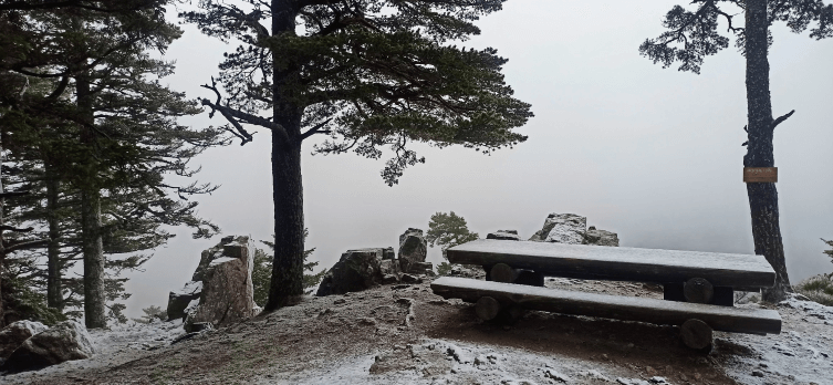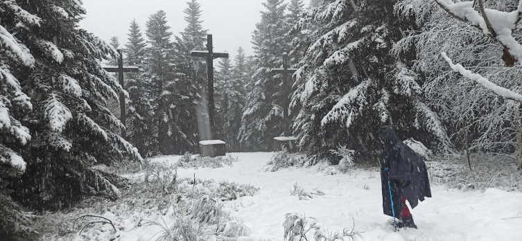 Le belvédère de Rochelipe, lui, n’offrait pas le large panorama habituel mais les abrupts rochers, coiffés de neige, en augmentaient le charme mystérieux. Plus on montait, plus la couche de neige s’épaississait ! Arrivées au sommet, les immenses croix du calvaire elles-mêmes étaient incrustées de flocons !