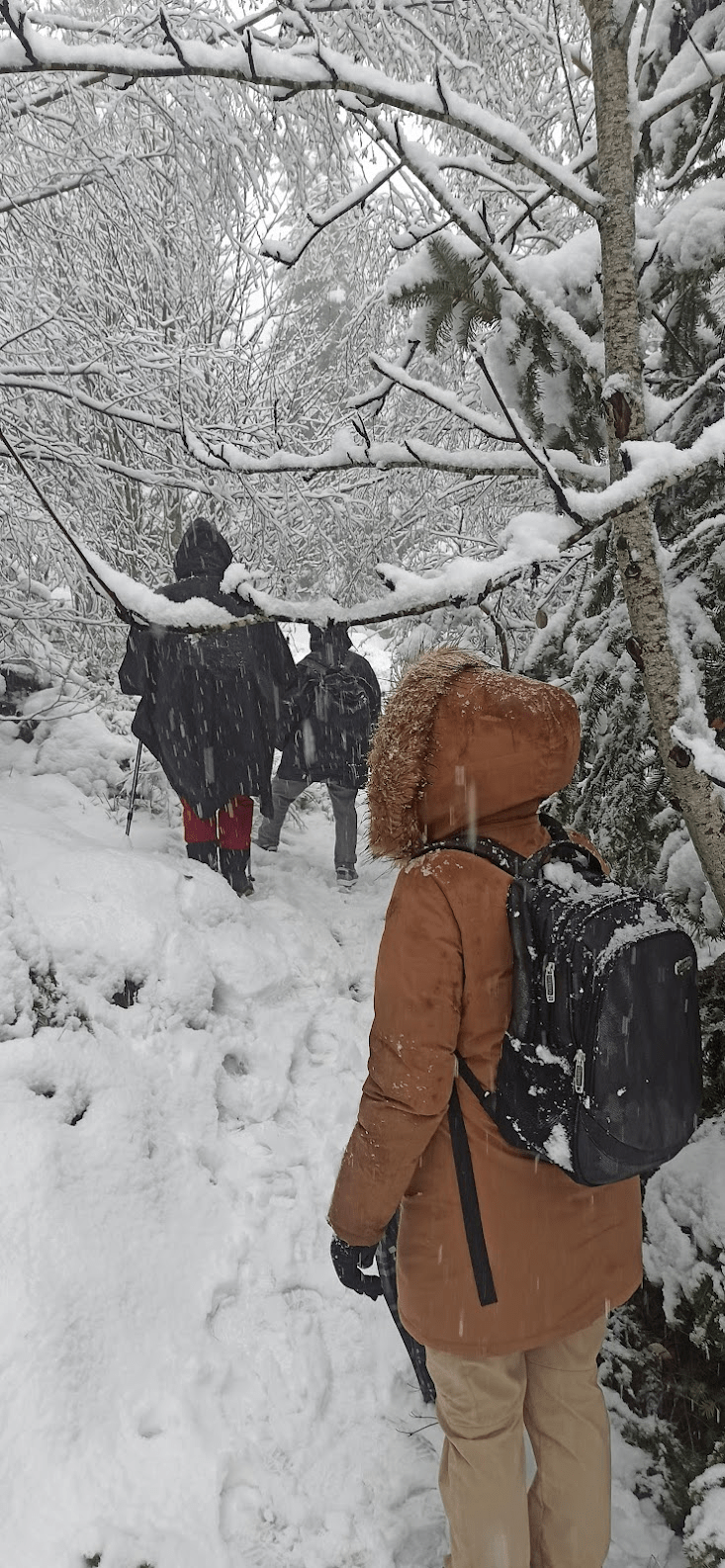 Nous étions quatre adultes avec une météo hivernale et la neige mouillée qui tombait allègrement à midi. Repli donc à la Maison Saint-Régis pour déjeuner ensemble et faire connaissance. Après ce fraternel temps de convivialité, en avant !, bien équipés, à l’assaut du Mont Chaix.