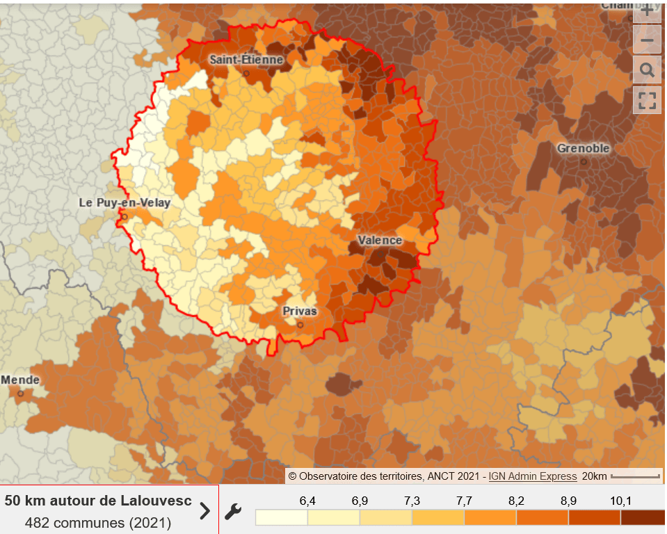 Selon ces calculs à Lalouvesc pour un appartement le loyer moyen est de 7,7 € m2 (9,1 € le m2 pour un T1 et pour un T3 et plus 6,1 € le m2) et pour une maison individuelle : 7,3 € le m2. Voir ci-dessous les variations dans un rayon de 50 km autour du village (la commune de Lalouvesc est juste au centre du cercle).