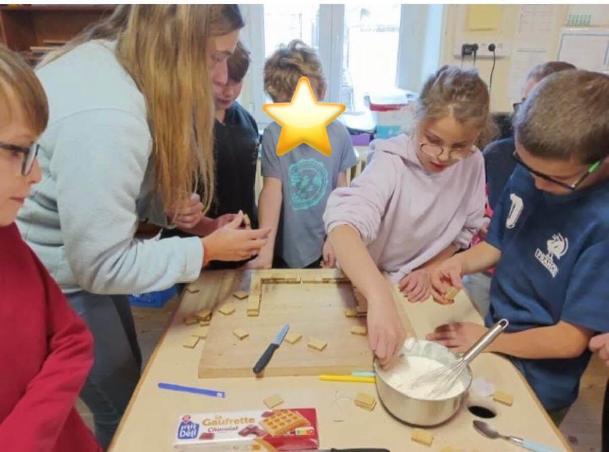 Puis, nous avons souhaité participer au concours de crèches organisé par l’association « les amis de Notre Dame d’Ay ». Il était indispensable d’être original et créatif. Les idées ont été nombreuses. Mais les élèves se sont finalement mis d’accord sur la fabrication d’une crèche totalement comestible ! Construction de l’étable en gaufrettes, personnages en pâte sablée, sapins en meringue, toit en langues de chat… Les élèves s’en sont donnés à cœur joie et étaient très fiers du résultat.