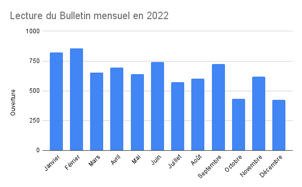 Deux Bulletins ont été lus plus de 800 fois, sept entre 600 et 750 fois, trois entre 400 et 600 fois. Le temps médian de lecture est compris entre 2mn 14s et 3mn 40s selon les numéros, cela signifie que plusieurs centaines d’internautes prennent largement le temps de lire les Bulletins.