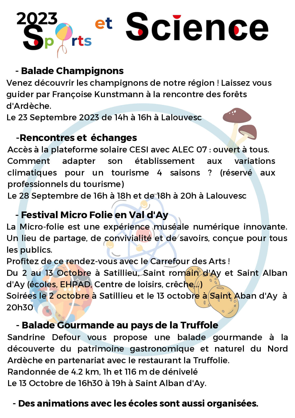 Dans le cadre de la fête de la science, l’Office de tourisme du Val d’Ay est partenaire d’ALEC 07 (Agence Locale de l’Énergie et du Climat de l’Ardèche), qui propose un événement, à destination des professionnels autour de la rénovation énergétique pour adapter son établissement aux variations de température pour un tourisme 4 saisons à Lalouvesc (à proximité de l’office de tourisme et dans la Maison Saint Régis), le jeudi 28 septembre sur inscription .