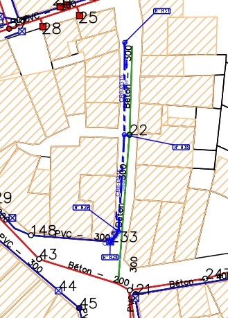 Deux tronçons, indiqués en pointillés bleus sur le plan sont installés. Chacun des tronçons s’écoule dans un sens différent, compte tenu de l’orientation de la pente.