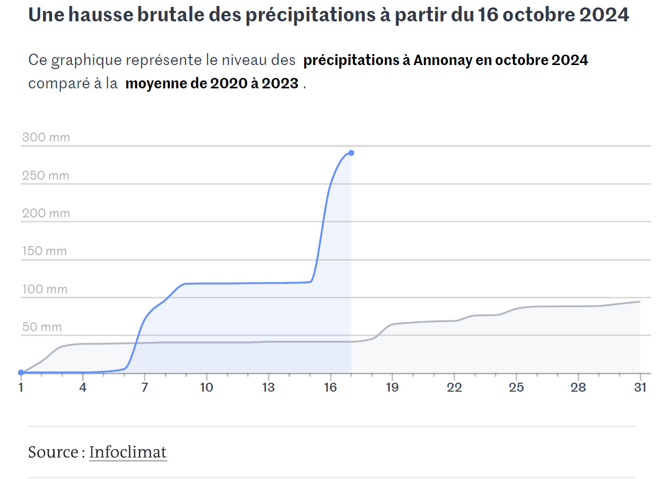 Sept fois plus de précipitations que d’habitude se sont déversées sur Annonay, commune la plus peuplée d’Ardèche depuis le début du mois d’octobre, dont la moitié en deux jours, les 16 et 17 octobre. Selon Météo-France, dans le département, “l’épisode cévenol est le plus intense sur deux jours jamais enregistré” depuis le début du XXe siècle, dépassant celui de septembre 1980, avec 700mm d’eau cumulée en 60 heures dans certaines localités des Cévennes ardéchoises.